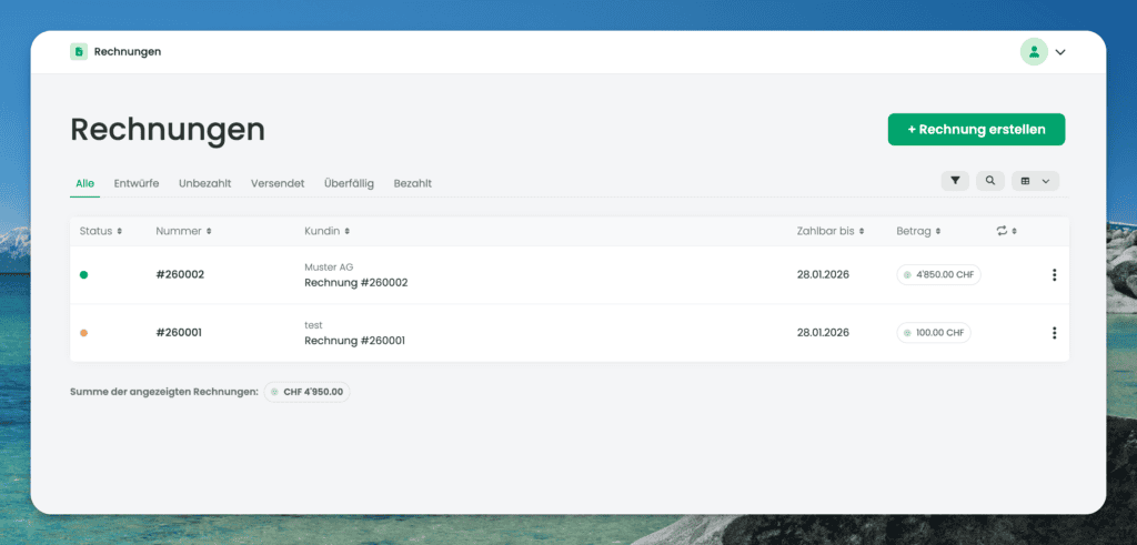Der Nachteil: du kannst deine Kund:innen nicht speichern und die tabellarische Aufführung von Dienstleistungen ist nicht wirklich möglich. Auch musst du selber im Auge behalten, welche Rechnungen welchen Status haben.