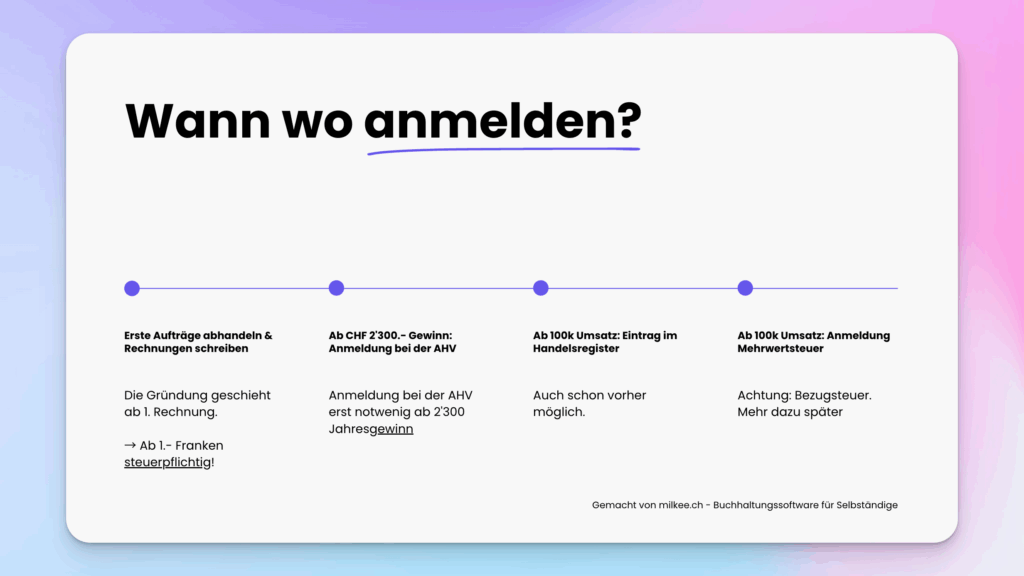 Ab 100’000 CHF Jahresumsatz musst du dich bei der MWST anmelden und einen Eintrag im Handelsregister vornehmen. Beides kannst du natürlich auch schon freiwillig im Vorhinein machen. Aber spätestens ab hier musst du.